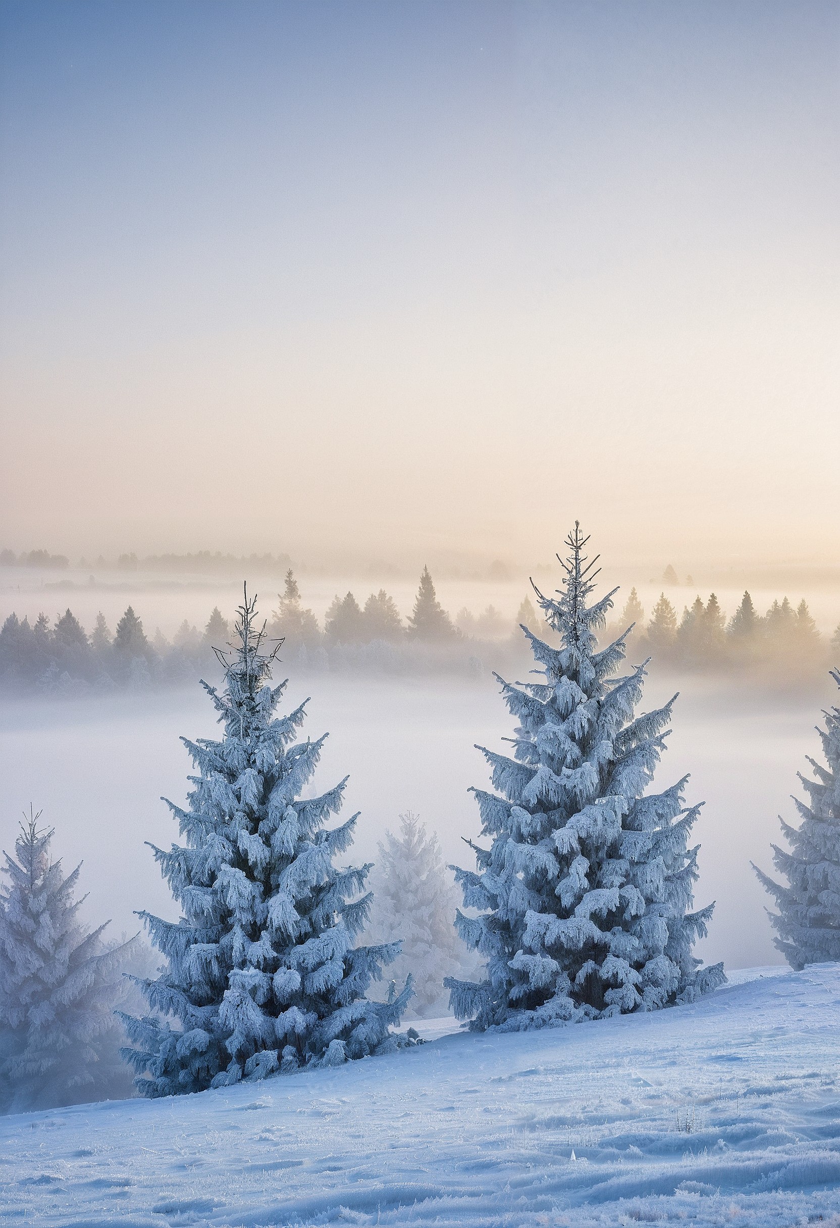 winter landscape with christmas trees frost covered with fog and snow, in the style of zeiss batis 18mm f/2.8, franz sedlacek, tomek setowski