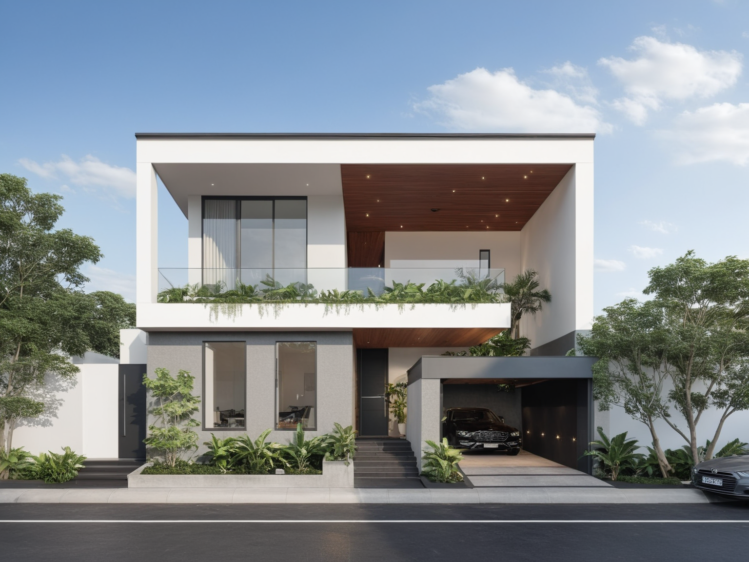 Architectural style Architectural style, <lora:JJsModernStyleHouse_XL:1>, ((Modern Style House)),(masterpiece) , ((best quality)), dramatic lighting, high quality outdoors, sky, day, cloud, tree, blue sky, building, scenery, road, real world location, sunlight, enough detail, high resolution,super realistic, Photorealistic, highly detailed, balcony, plants, door, car, paving, , architectural drawing, highly detailed , . Clean lines, geometric shapes, minimalist, modern, architectural drawing, highly detailed