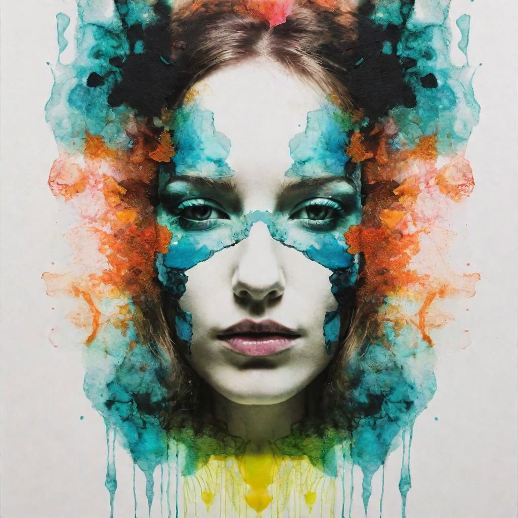 Rorschach mixed media photography of a woman face made with a combination of photography, alcohol ink painting, drawing and collage, neon palette color