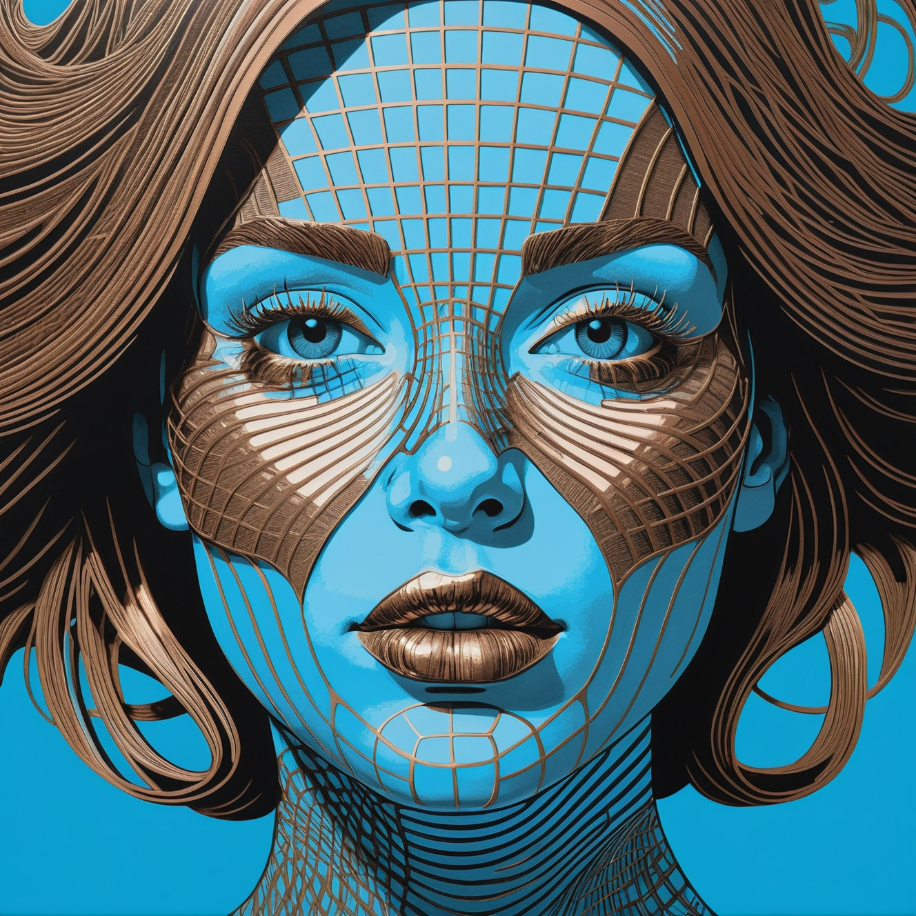 doodle art 3D, in the style of pop art-inspired portraits, interference patterns, light sky-blue and bronze, realistic hyper-detail, engraved line-work, graphic novel, face of a woman