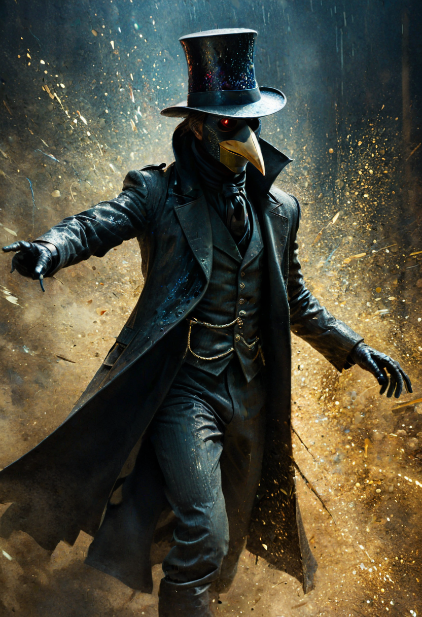 surrealism painting, 16k, extreme detail, fine textures, deep shadows, dark, sharp lines, (do puppets bleed glitter when you shoot them?), somber colors. beautiful. masterpiece. ((mysterious)). random. petite. reflections. romanian plague doctor <lora:JuggerCineXL2:0.8> Movie Still, Film Still, Cinematic, Cinematic Shot, Cinematic Lighting <lora:xl_more_art-full_v1:0.95> <lora:more_details:0.68> <lora:EnvyActionShotXL01:0.8> action shot