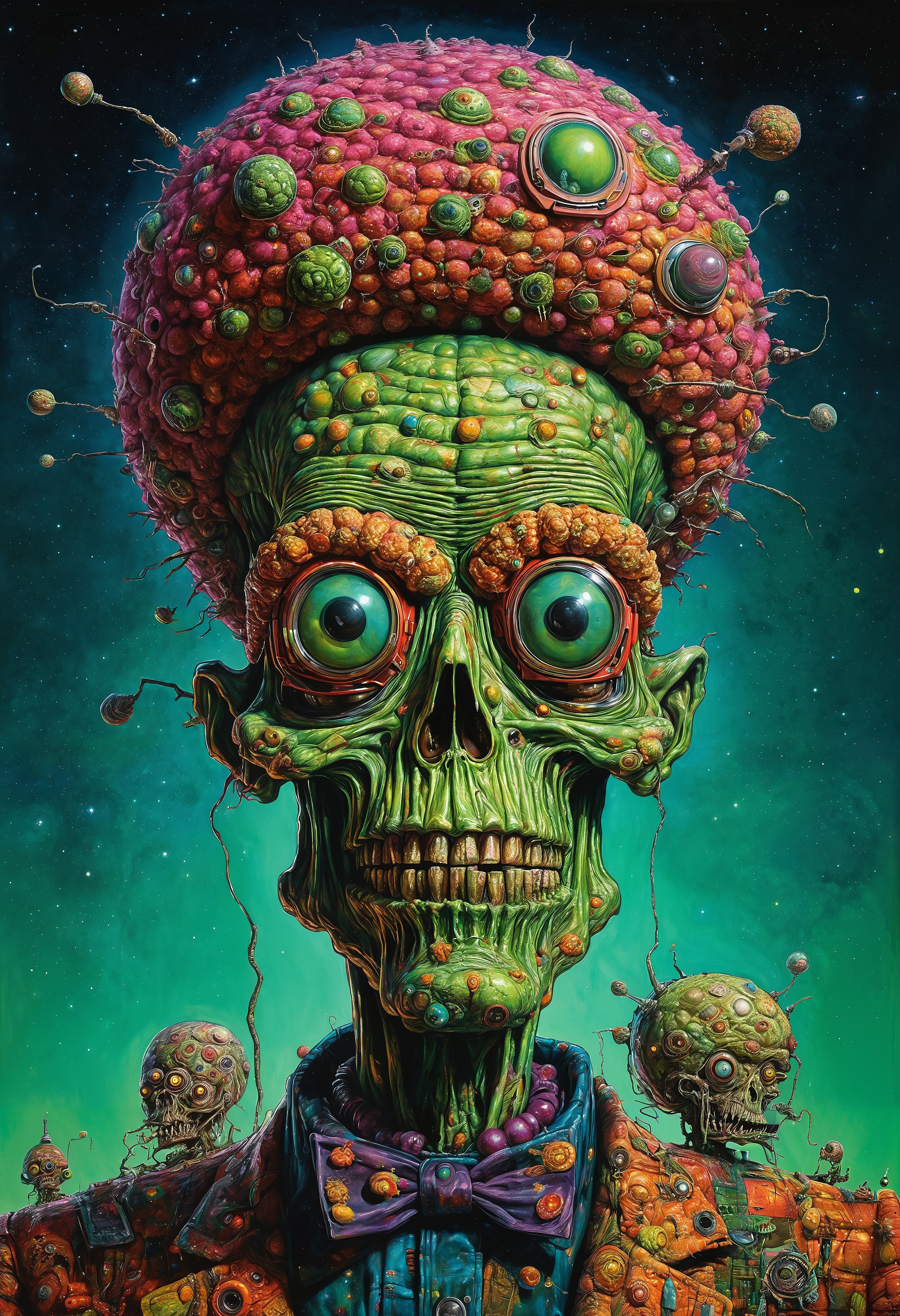 Mars Attacks, in the style of iconic pop culture caricatures, cosmic horror, grotesque caricatures, giuseppe arcimboldo, schizocore, colorful moebius, green academia