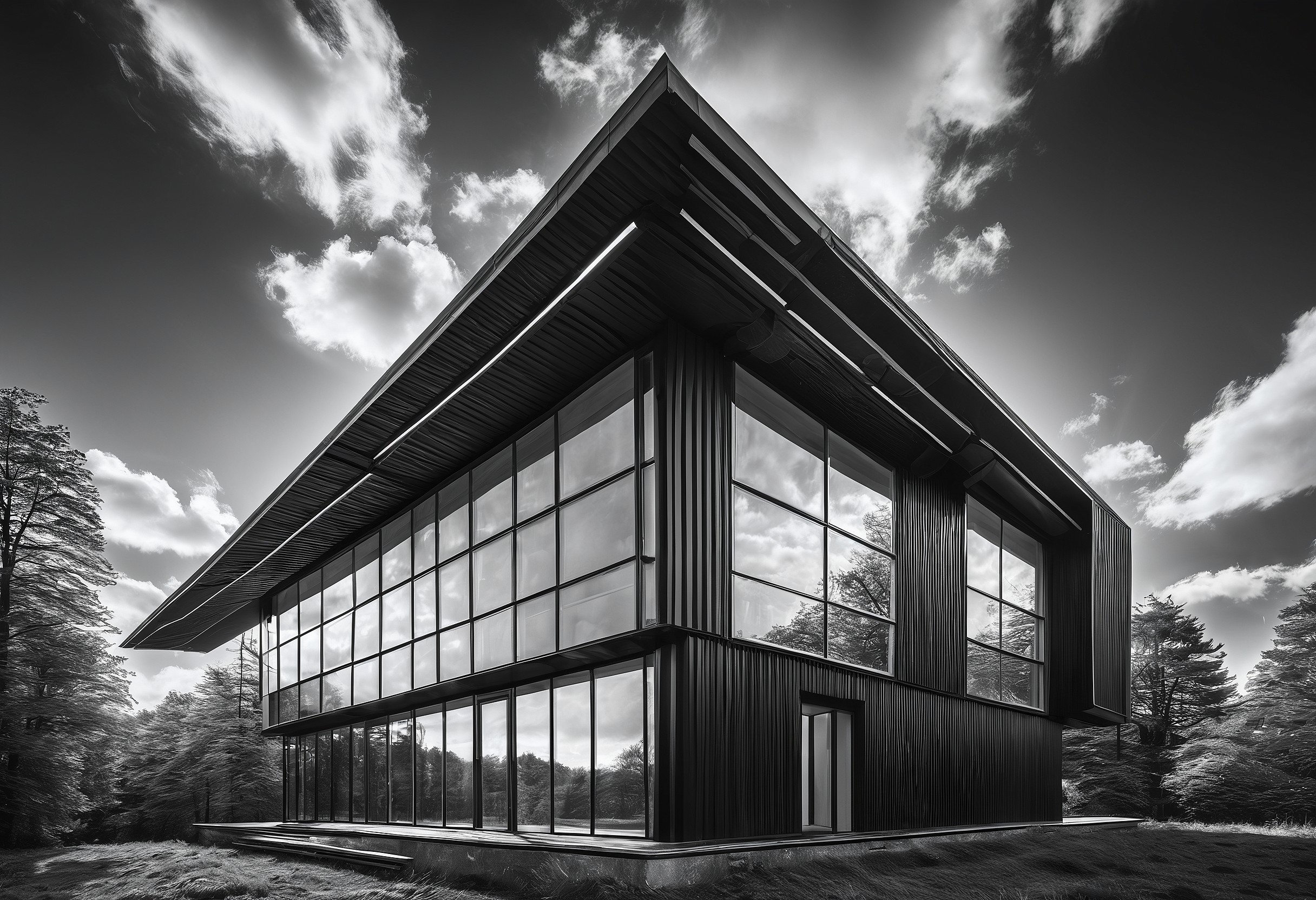 a large black and white building with sky light coming from it, in the style of john wilhelm, solarization, uhd image, filip hodas, backlight, pont-aven school, sleek and stylized