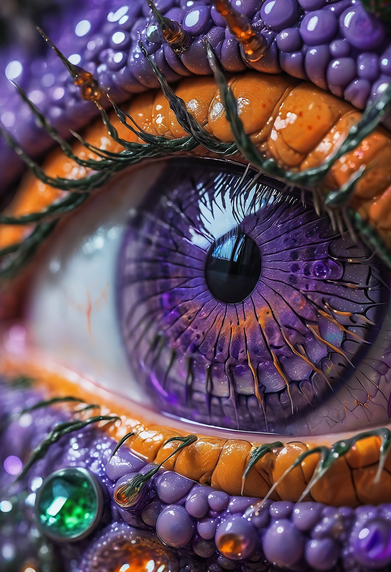 the eye of the dragon, purple and lavender scales, lavender and green eyes, orange dragon tears drip from the eye, and glitter, extreme closeup, macro photography, cyberpunk