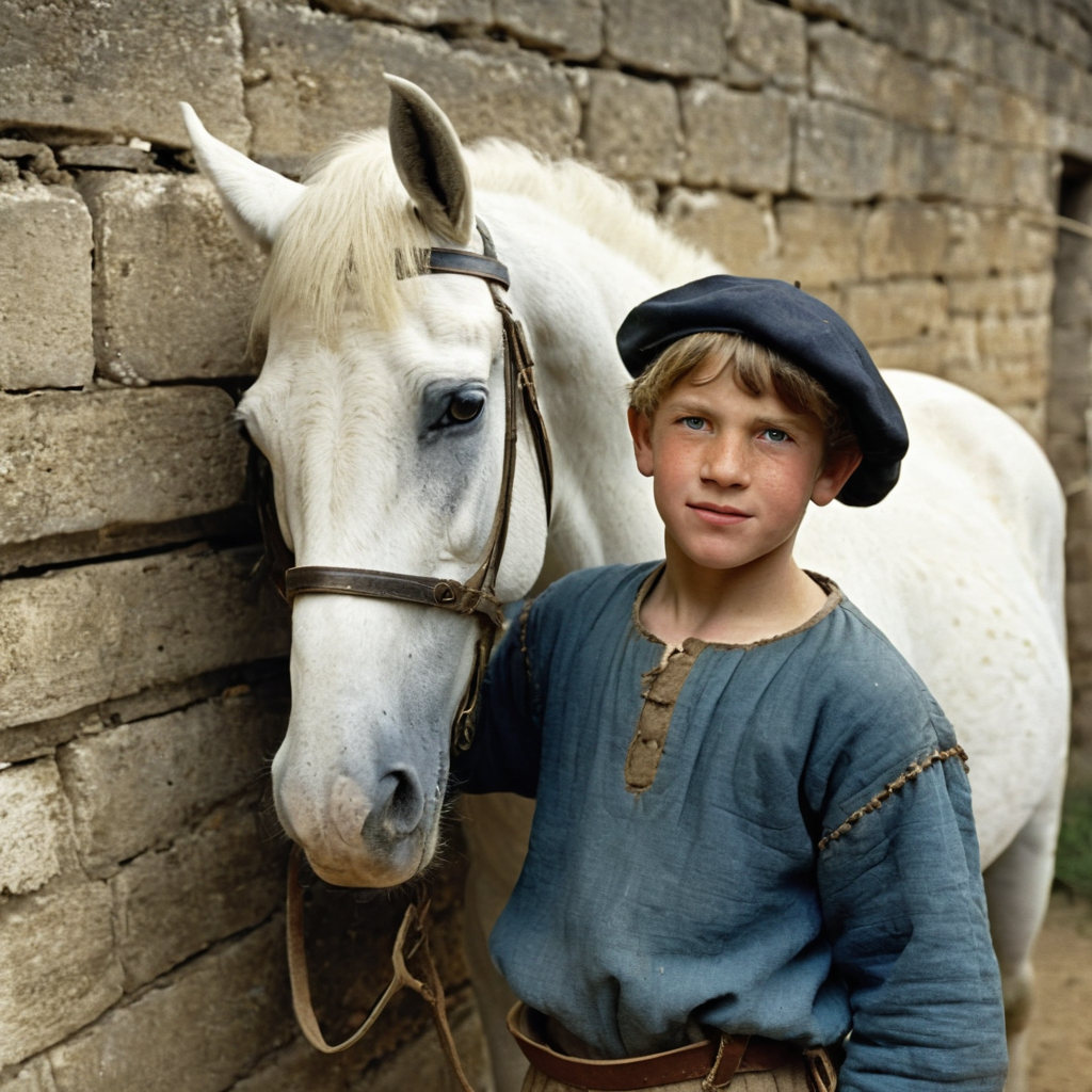 a medieval stable boy, peasant clothes, cap, (faint of enigmatic smile:0.25), stern, looking at viewer, eye contact, portrait, vintage photo, brushing a white horse, castle stables,
