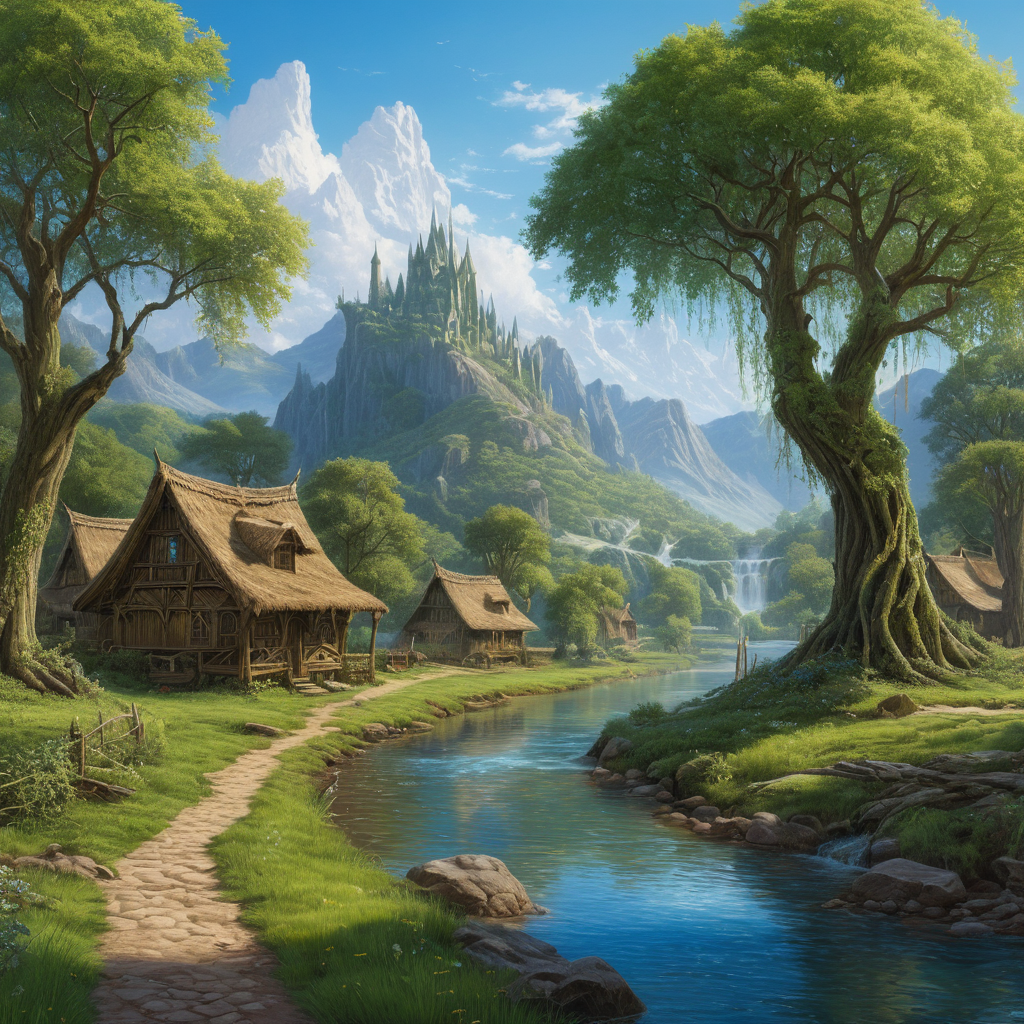 a beautiful and highly detailed painting of a woven willow elven town in a forest, a river, blue clear sky, epic scale, insanely complex, hyperdetailed, sharp focus, hyperrealism, artstation, deviantart, 4K, 8K,
