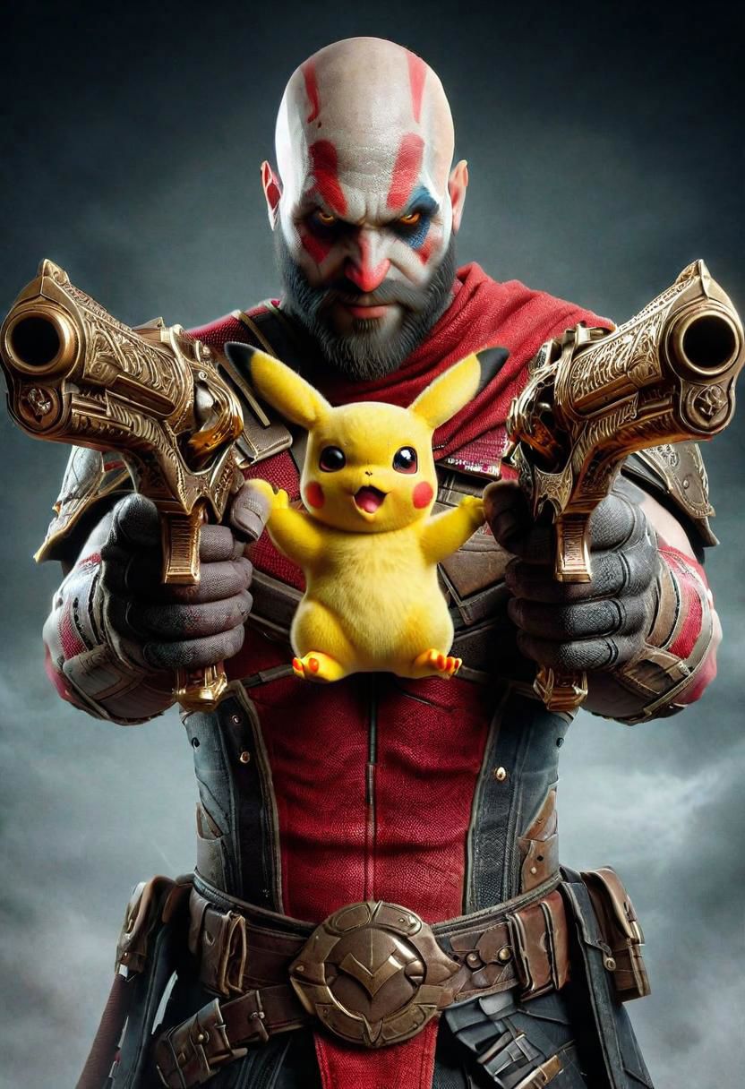 (playfully:1.5) kratos, holding pikachu, 8k, F2.8, RAW Photo, ultra detailed <lora:XL_Weapon_Dual_Pistols_-_By_HailoKnight:0.8>