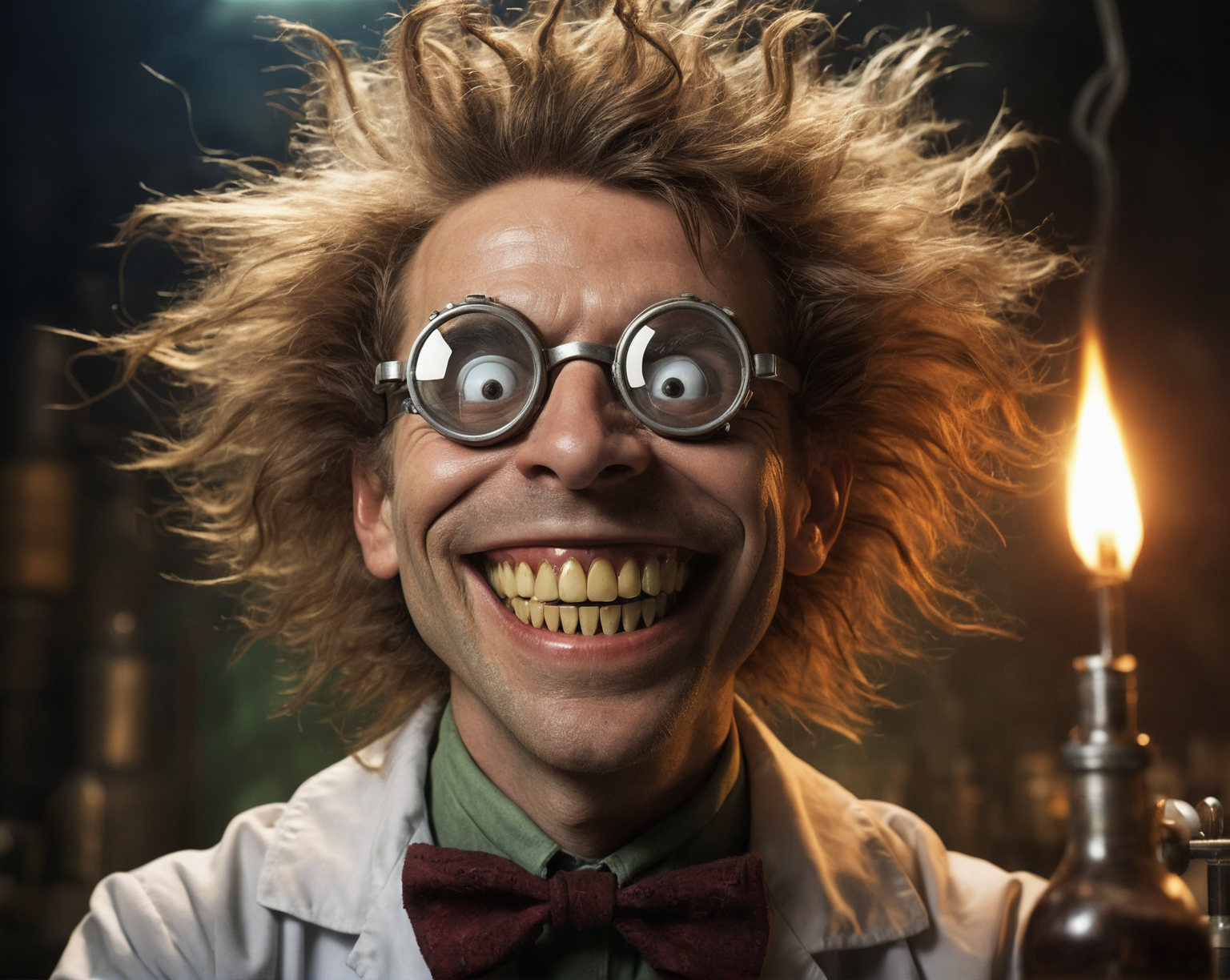 (Masterpiece, best quality, professional photo, zoomed out, detailed, film grain:1.2), (steampunk laboratory, ("mad scientist with fuzzy hair as if something exploded in the face" with big grin, (smile:1.8), many teeth:1.8)), oddly colored potion, goggles, soot, dirty, shimmering, complex scene, dramatic lighting, 8k, detailed, hyper realistic, (shadowplay, naturalistic lighting, specular reflections), dark, horror, otherwordly, mysterious, in godlike style