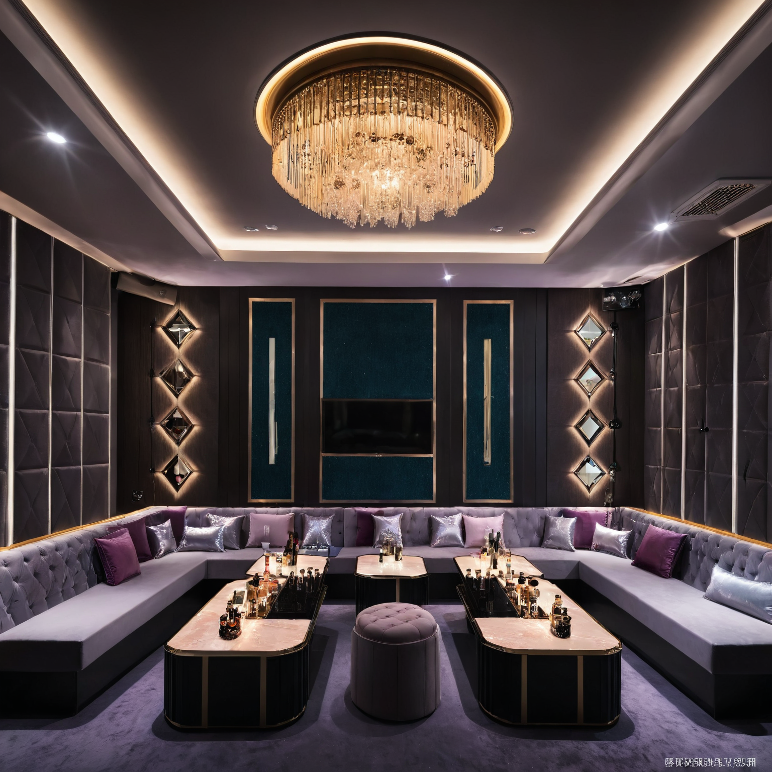 <lora:JJsKaraokeRoom_XL:1>,((Karaoke Room)), ((dramatic lighting)), Masterpiece, high quality, best quality, authentic, super detail , high quality, ceiling light,no humans, . night, highly detailed, screen, sofa, table,
