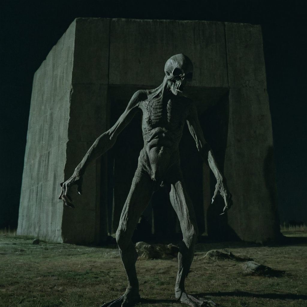 (found footage:1.1) of (a creature outdoors performing forbidden dark arts:1.3), in a very large ritualistic monolithic structure at night,