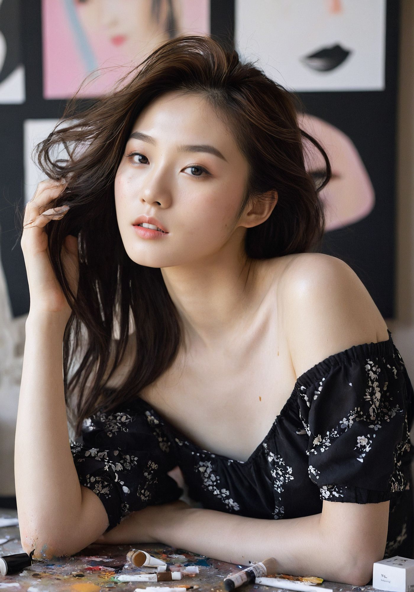 artist's rest after creative outburst, serene face, closed eyes, wearing black attire with off shoulder, surrounded by art supplies, expressive brush strokes, modern edgy aesthetic, vibrant splashes of paint, (lying on the messy table, from top:1.6),