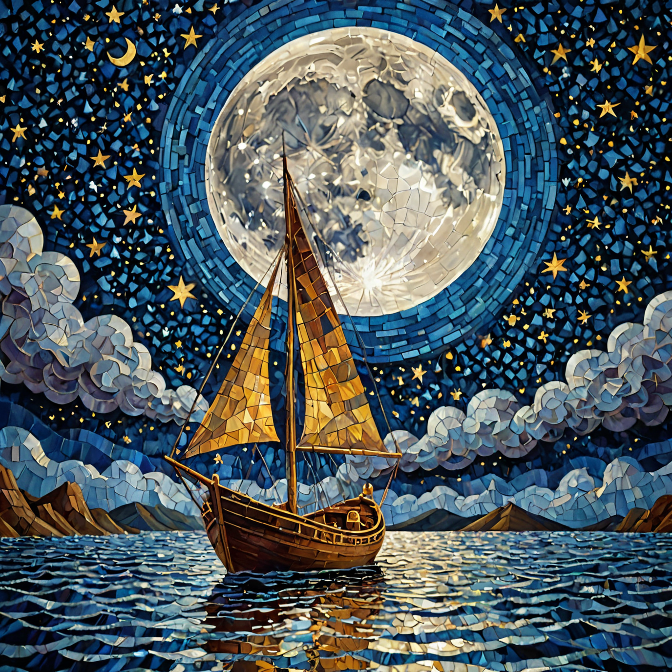 Illuminated ("The moon, a silver boat, sails through the sea of stars, painting dreams on the night sky.":1.2) , Suffering, hillside, Cubism, side lit, Selective focus, Kodachrome, gilded technique, Batik