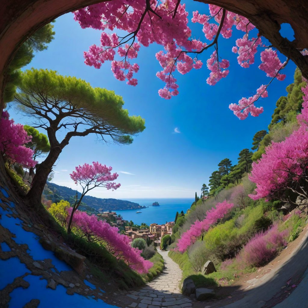 (vibrant art by Børge Bredenbekk:0.9) and (Daniel Lieske:1.3) and (Art Fitzpatrick:1.2) and (Abbott Handerson Thayer:1.2) , 8k, (cherry blossom pink theme:0.7) , landscape of a (Portofino:1.3) in the distance there is a Blue nebula, it is very Kingcore and Great, desolate jungle and Oort cloud in background, Spring, Hopeless, Cartelcore, Sun Rays, Fish-eye Lens, complementary colors, fairy tale, Kintsugi, arthouse, photolab
