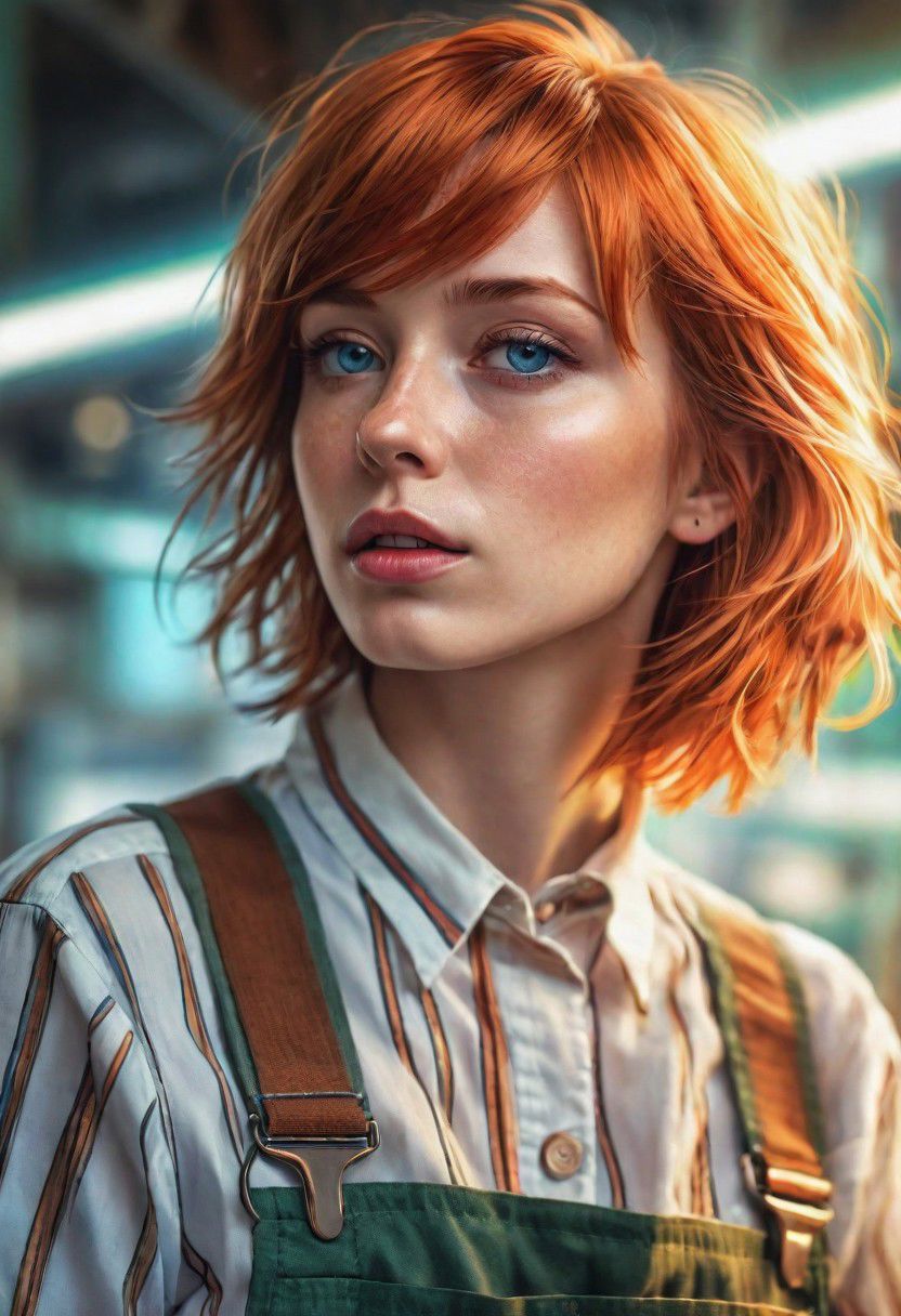 (best quality, masterpiece, beautiful and aesthetic:1.2, colorful, dynamic angle)((Full shot)), (highly detailed illustration), science fiction, extreme detailed, colorful,35mm, bokeh, 9:16, (intricate details, hyperdetailed:1.15), detailed, sunlight passing through hair (high contrast, official art, extreme detailed, highest detailed), <lora:Leeloo_5thElement_MillaJovovich_smf_lora_v2:0.9>, 1girl, l3e1o057h-smf, solo, realistic, shirt, blue eyes, looking at viewer, lips, red hair, parted lips, short hair, upper body, striped shirt, white shirt, suspenders, short sleeves, blurry, nose, bangs, orange hair, indoors, blunt bangs, green eyes, blurry background, portrait <lora:add_detail:0.5>