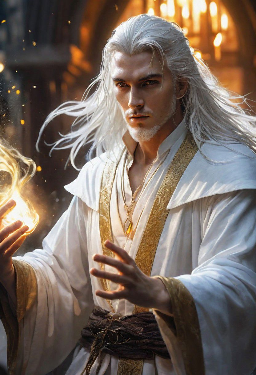 portrait of a handsome young male wizard, white wizard shirt with golden trim, white robe moving in the wind, long white hair, fully clothed, perfect face, handsome, (perfect composition:1.4), deviantart hd, artstation hd, concept art, detailed face and body, award-winning photography, margins, detailed face,backlight, 12k ultrarealistic, ray tracing, intense gaze, looking at the viewer, cinematic lighting, art by Grzegorz Rutkowski, embers, high fantasy background, action pose, water splash, misty
