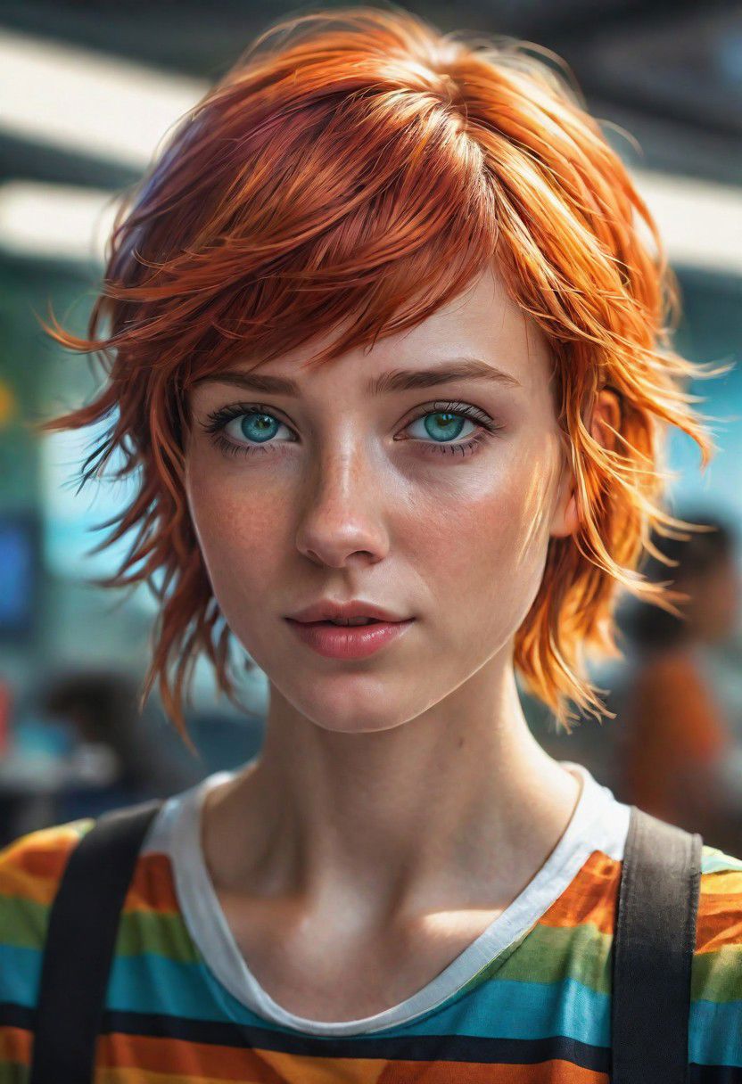 (best quality, masterpiece, beautiful and aesthetic:1.2, colorful, dynamic angle)((Full shot)), (highly detailed illustration), science fiction, extreme detailed, colorful,35mm, bokeh, 9:16, (intricate details, hyperdetailed:1.15), detailed, sunlight passing through hair (high contrast, official art, extreme detailed, highest detailed), <lora:Leeloo_5thElement_MillaJovovich_smf_lora_v2:0.9>, 1girl, l3e1o057h-smf, solo, realistic, shirt, blue eyes, looking at viewer, lips, red hair, parted lips, short hair, upper body, striped shirt, white shirt, suspenders, short sleeves, blurry, nose, bangs, orange hair, indoors, blunt bangs, green eyes, blurry background, portrait <lora:add_detail:0.5>