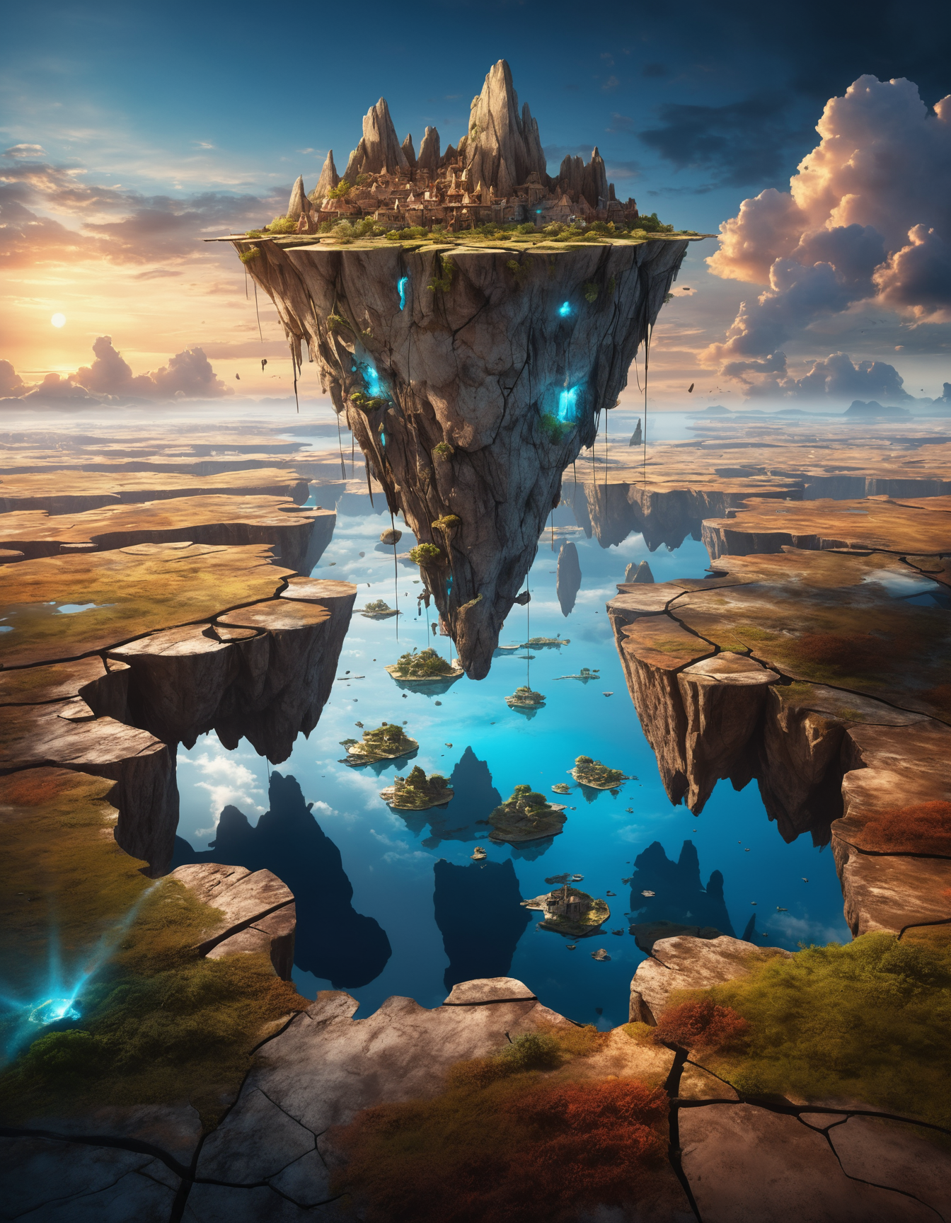 award winning adventure-themed photograph, colored photography, fragmented landscape of floating islands in an endless sky, exploration, mysterious, magical, cracked, crisscrossed by cracks, rim lighting, volumetric, trending on art station, 8k resolution