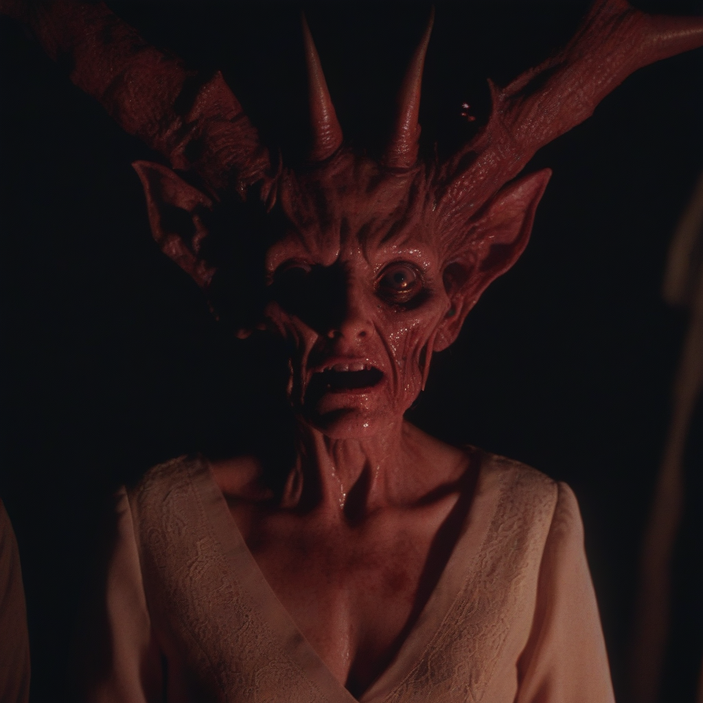 demons behind mother, symmetry, production still, dark horror, soft lighting, cinematic, red-core, 35 mm, panavision, visible film grain, highly detailed
