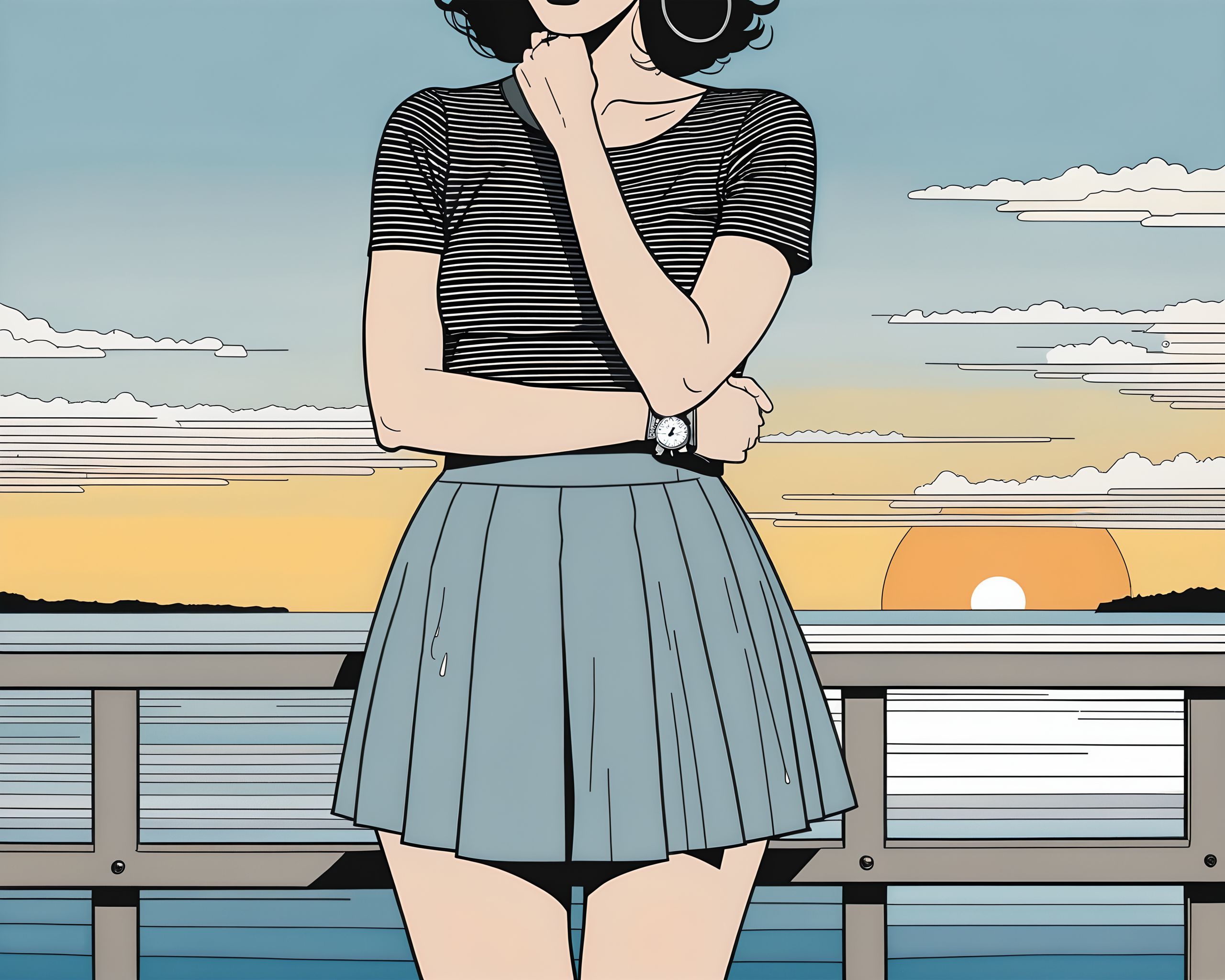 Fit, thigh gap, skirt, Radial balance, Sunrise, Water, Ellipse, ultra detailed, intricate,,art by Adrian Tomine,captured, in tears, handcuffed