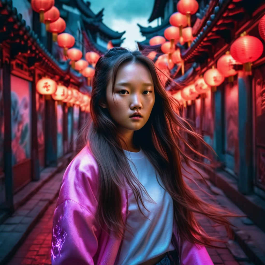 lilychee fashion photo, Realistic 8K portrait: woman, long hair with body, natural skin, pores, neon lights, china town, dragon flying through the air, fashion clothing; dramatic lighting, cinematic colors; hyper-above