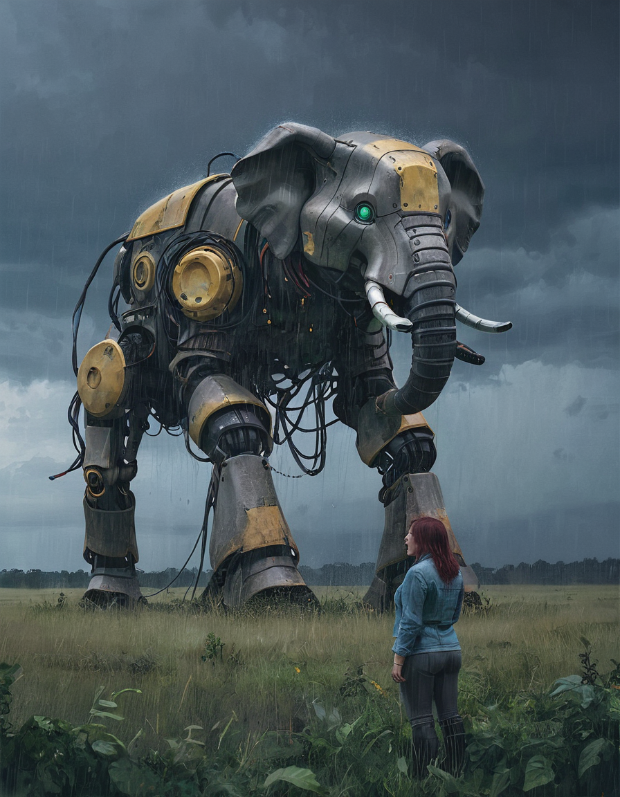 <lora:ssta:0.6> ssta giant pachyderm robot, overgrown pasture, curious woman, wide shot, rain, storm, lighting creates a dramatic atmosphere