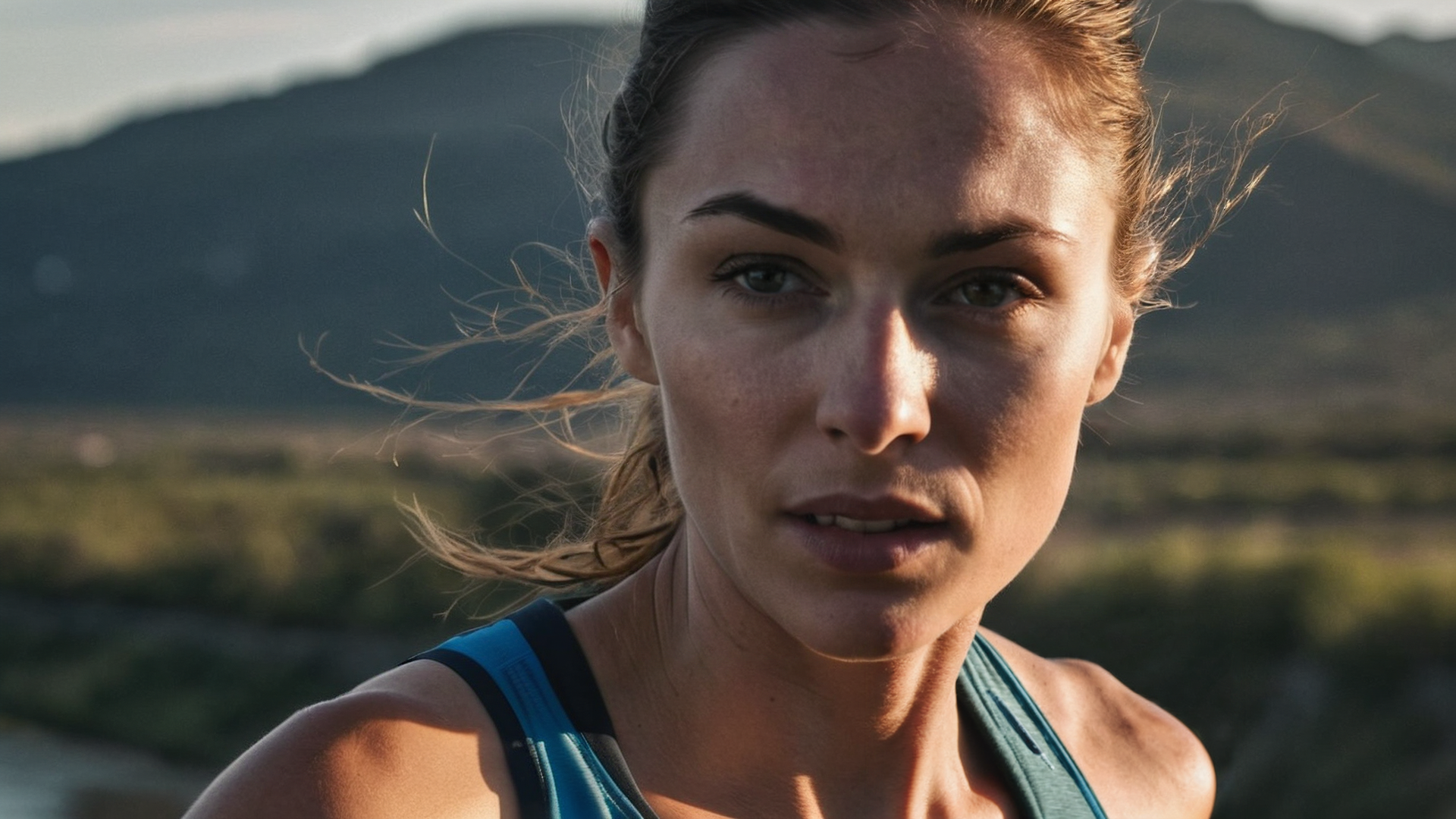 cinematic photo close up, portrait, woman, jogging, running, fitness, nike swoosh, spectacular angle, mountains, river, sunset, Vermeer lighting, shot on Hasselblad camera,, award winning photo, high quality photography, 4k, hd, sharp focus, high resolution, wide dynamic range, natural skin texture,detailed skin,pores,extreme skin details . 35mm photograph, film, bokeh, professional, 4k, highly detailed