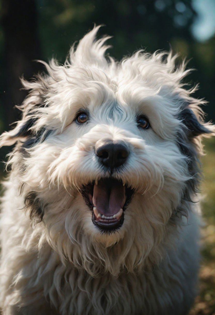 Capture the playful spirit from below as a majestic Old English Sheepdog with its fur cascading like waves, eagerly leaping towards the viewer. Let the joyous energy and fluffy charm of this moment shine through your lens. closeup 8k uhd, Atmospheric haze, Atmospheric lighting, Candid camera, Cinemascope, Cinematic film still, Color graded cinematic, Dslr, Epic, Eye catchlights, Film grain, High detailed texture, High quality, Highly detailed, Highly detailed photography, Imperfections, Moody, Natural, OverallDetail, Photorealistic, Raw photo, Shallow depth of field, Shallow dof, Skin pores, Soft lighting, Very detailed,