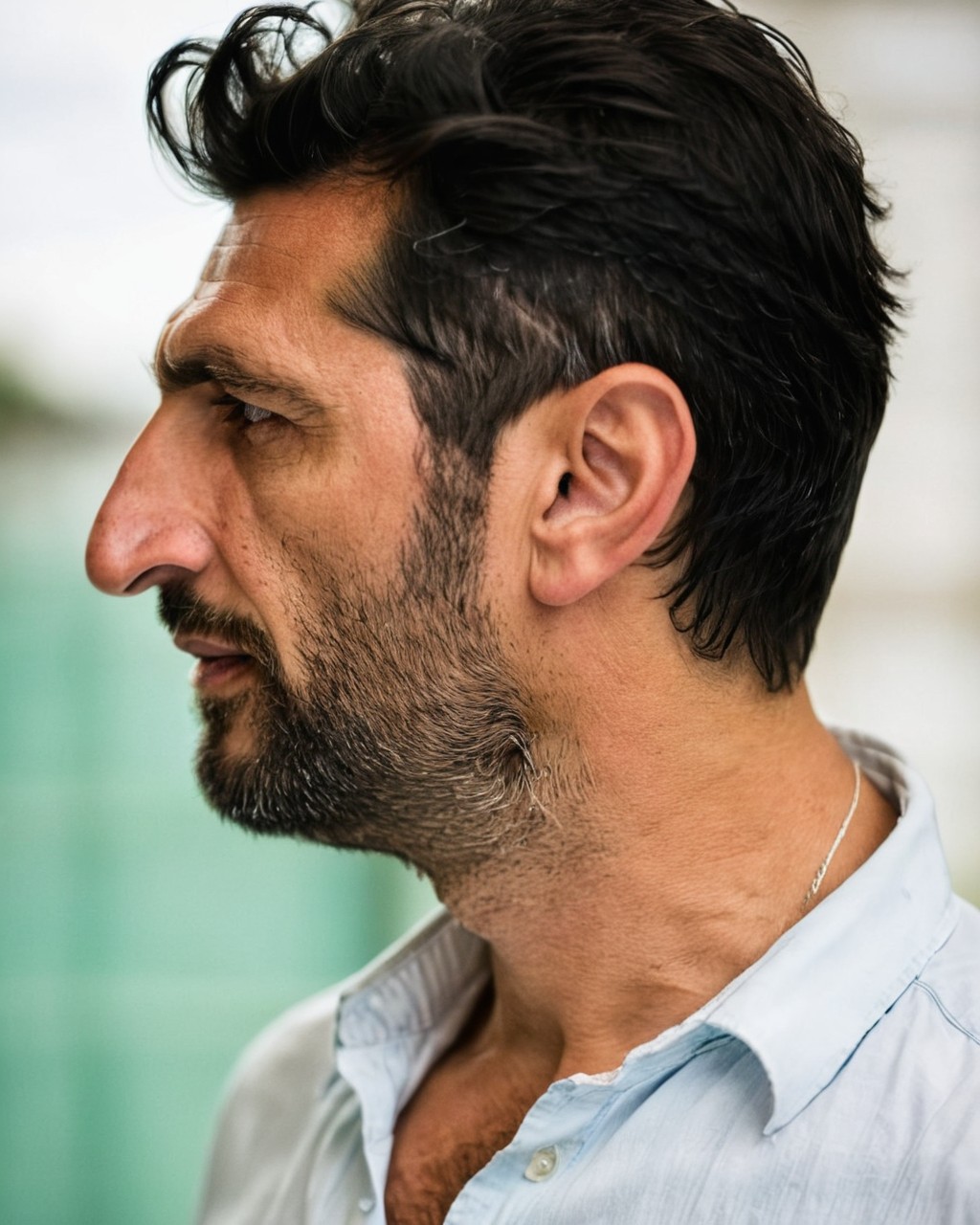 <lora:Fares_Fares_Flexible:0.8> profile side view face close-up (Fares Fares:1.3) age 35 wearing open unbuttoned shirt, short grease hair, t-shirt, natural lighting, sunlight, 4k uhd, dslr, soft light, high quality, Fujifilm XT3