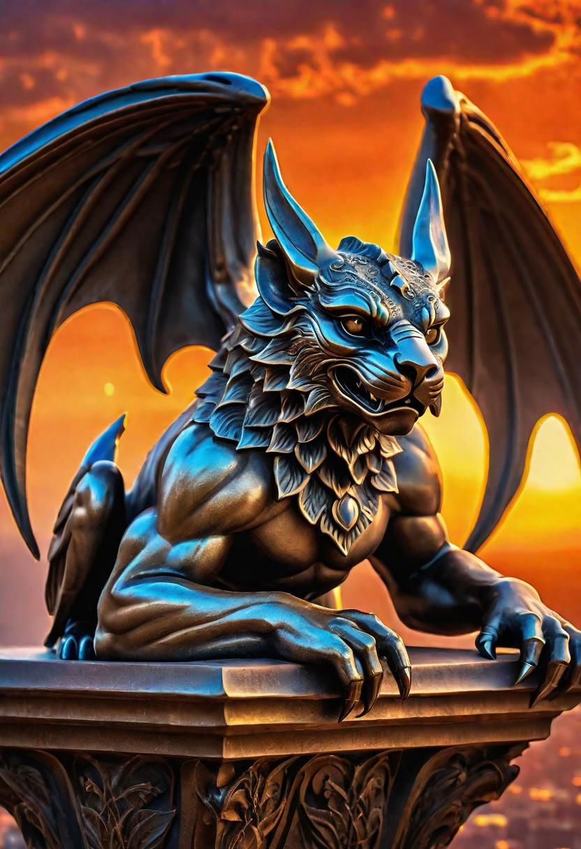 a hyper detailed bronze gargoyle, gargoyle is highly detailed, with its wings and claws all rendered in exquisite detail, filigree, intricate details, against the background of the setting fiery sun, super mystical atmosphere and aura, clear small details, digital painting, high quality, by Boris Vallejo, rendered in HDR 8K resolution, full of wonderful and dazzling colors, the setting sun is ablaze with fiery light, and it casts a warm glow on the gargoyle, effect of high-quality cinematic cameras, depth of field, sharp focus, very high detail
