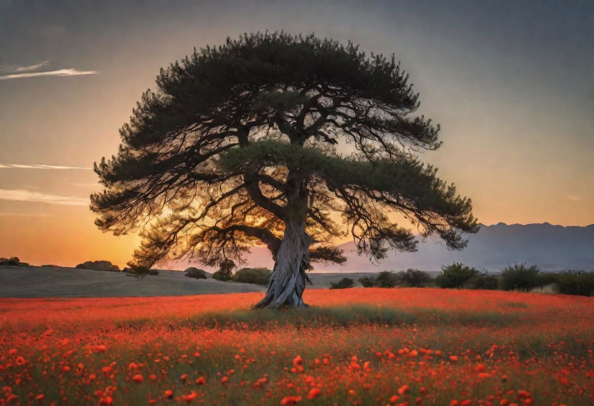 A Monterrey cypress tree in summer time, grass on the fields with some poppy flowers, early morning, , background is sunset, no clouds, warm lighting, highly detailed, film grain, Fujifilm XT-3