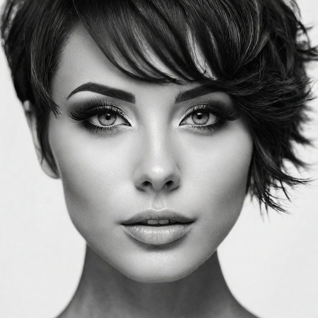 ultra sharp portrait photography of a beautiful woman with short feminine hair, ultra detailed, detailed eyes, black and white, high contrast ar 3:5