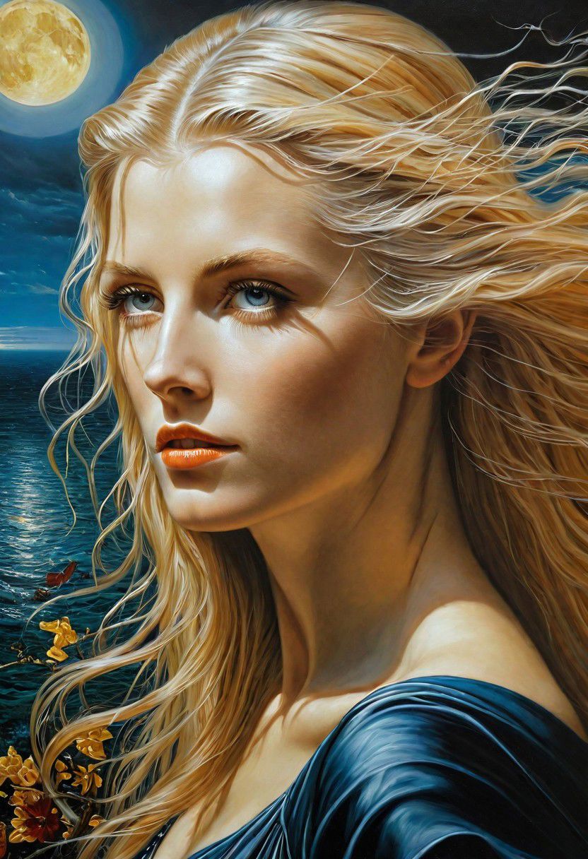 painting, an eye contact of a blond woman with long hair and dark theme, Michael Cheval, 4k