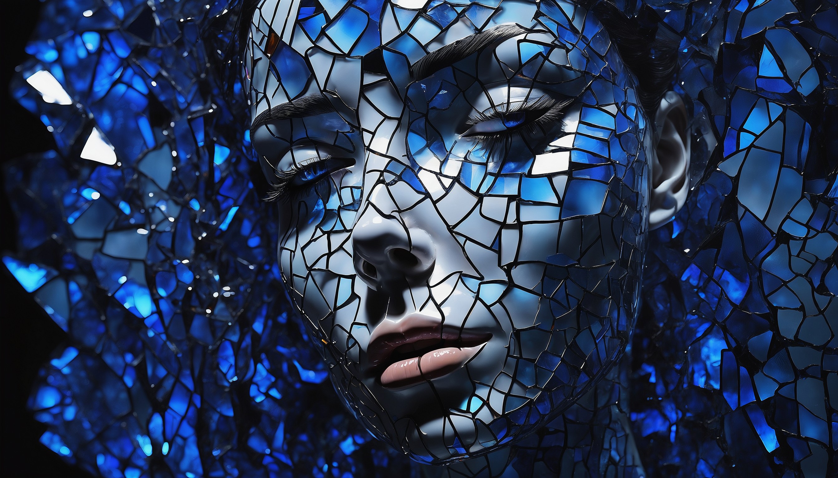An abstract representation of a woman's face, her skin is made of Made_of_pieces_broken_glass, transparent, glowing dark blue from the inside, breaking through a wall of glass, background is darkness, (dimly lit:1.2), focusing on her vivid eyes