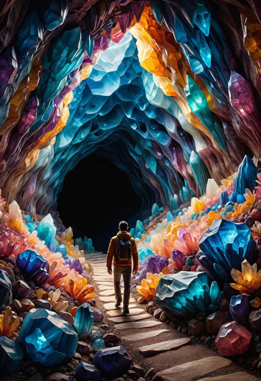 a highly detailed digital illustration of ((a luminous ral-ntrgmstn cavern, a figure walking in the distance)), highly detailed, intricate, volumetric lighting, masterpiece, best quality, dramatic, epic, (white, azure, pastel colors, pastel pink, pastel yellow, pastel purple)