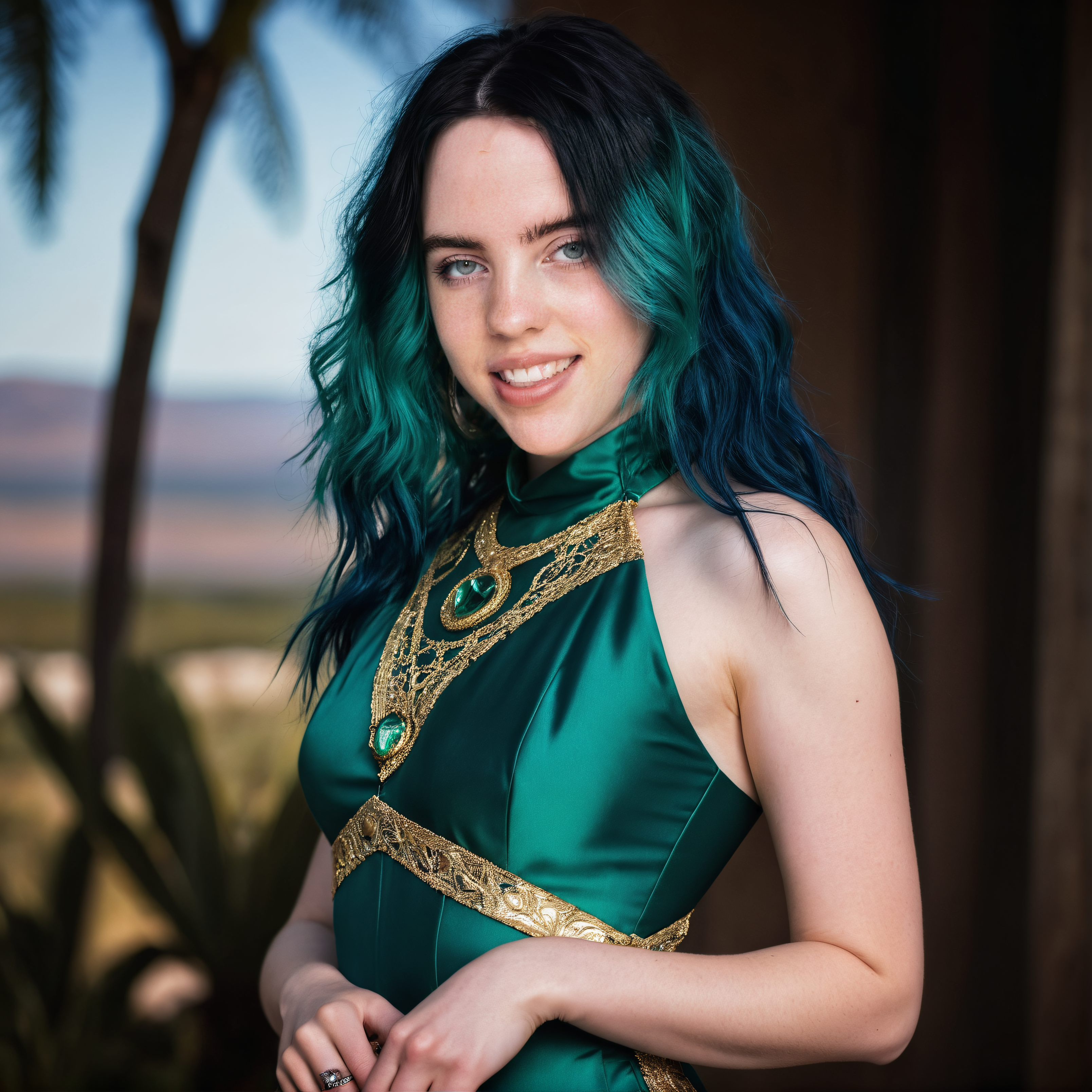 <lora:billie-eilish:0.35> billie eilish, smile, perfect white teeth, tidy hair, 20 year old woman, detailed skin texture, matte skin, eye contact, comfortable confident expression, black hair sharp image, best quality, high resolution, saturated colors, sexy, (cinematic lighting:1.3) (full body shot, full body shot, full body shot, wide shot, zoomed out:1.7) (photo from the profile:1.5) big tits, big breasts (kneeling:1.8) Halter Neck Lingerie Set: A lingerie set featuring a halter neck bra and matching panties. cosplaying as Merida from "Brave" in her emerald green Celtic-style gown with gold embroidery accompanied by her signature archery set. In the heart of the Scottish Highlands she challenges the norms and fights for her freedom