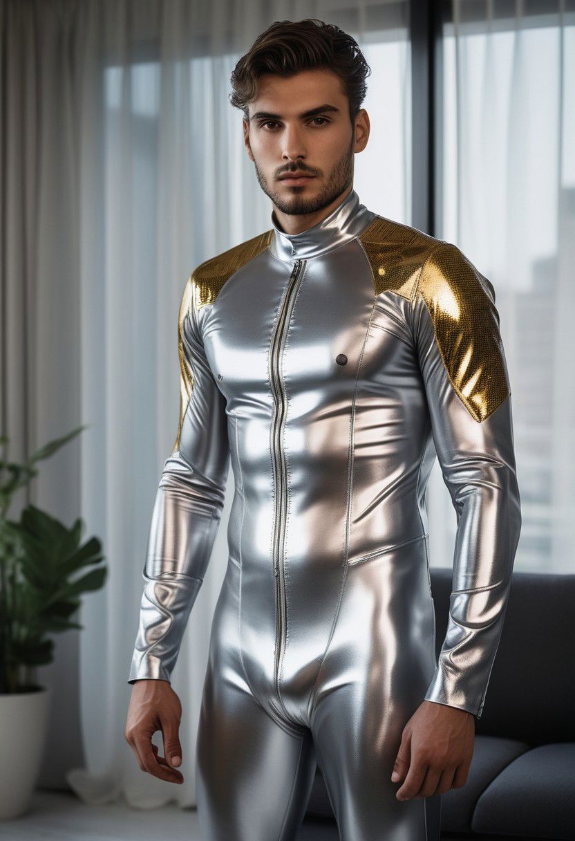 two strong 24-year-old italian hunk males, with a side fringe curtains hairstyle, detailed face, confused expressions, wearing a skin tight silver latex suits with gold and gray latex details, standing at attention posture, fullbody shot, on a modern living room, looking to the camera, detailed face, professional photography, shot on sony a 7RIII , looking to the camera, detailed skin face and eyes, natural lighting , film grain, low contrast, natural face, dark circles under eyes
