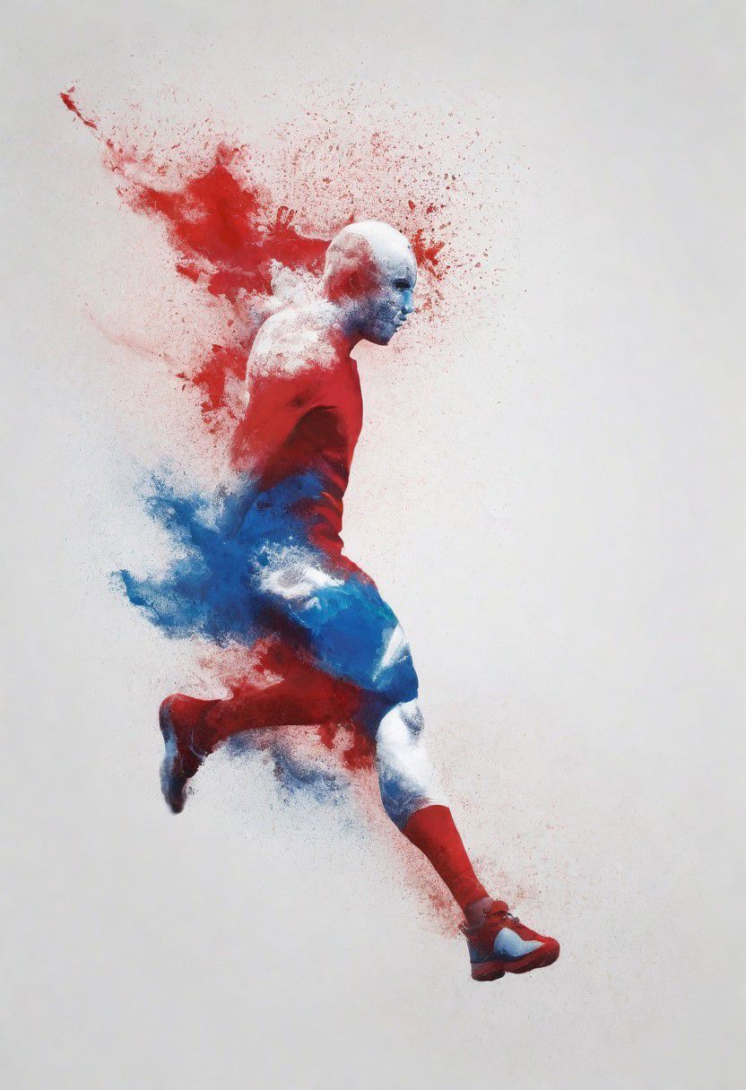 dust floating in the air transforming into a white hollow male silhouette resembling different olympic sports, use only colors blue & white & red, (amount of particles: 1.35), iconic, glossy white background, abstract, impressionistic, aesthetics, highest quality, ((highest resolution))