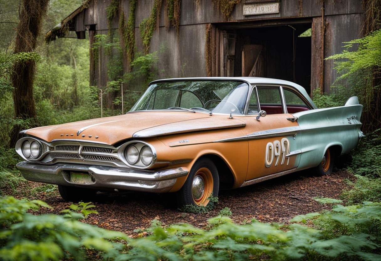 (high res photography, UHD,8k), funny bizarre weird 1960 Plymouth Belvedere, design concept style, two-tone paintjob, background abandoned overgrown Art Deco cinema,