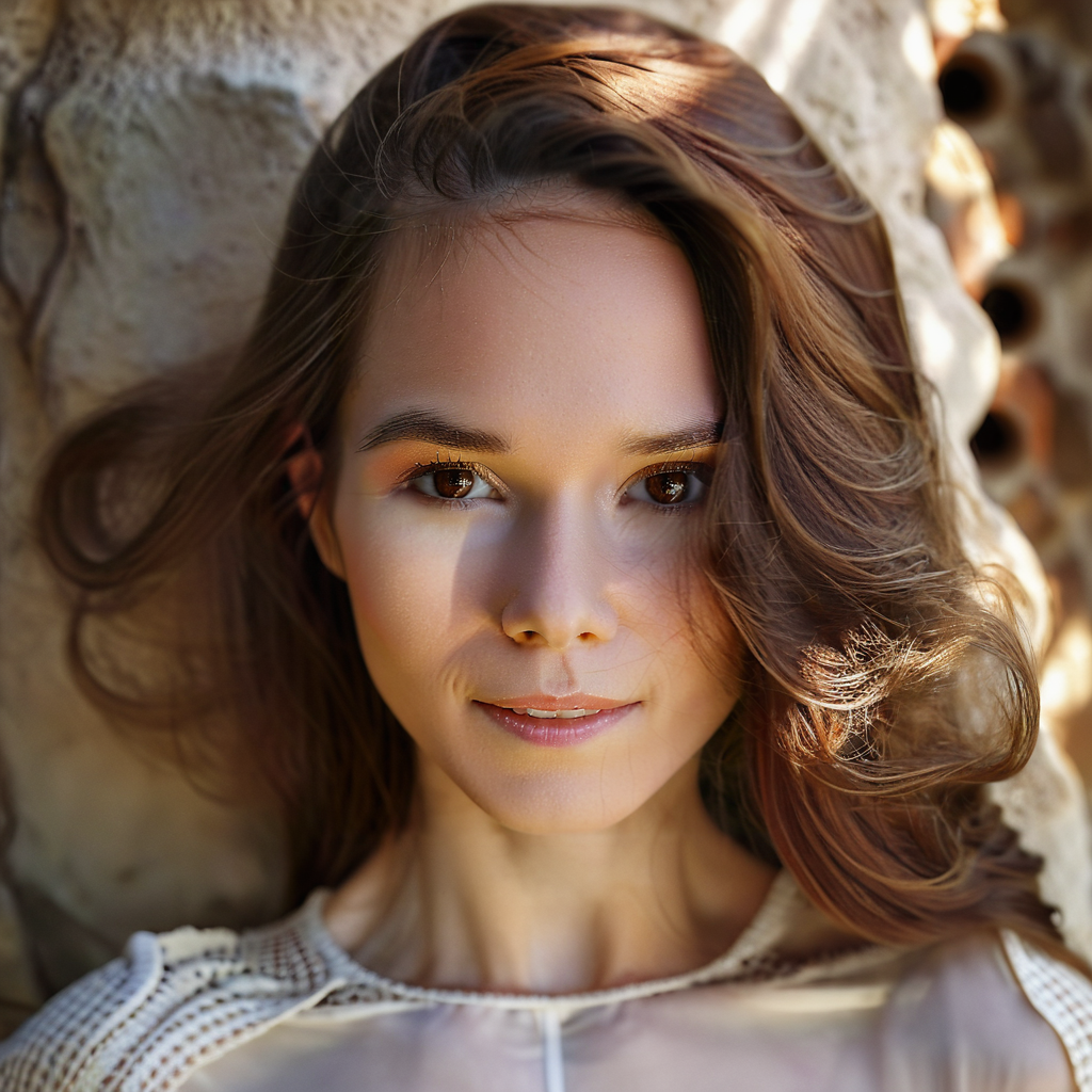 symmetrical headshot, honest, RAW, warm tones, sharp face focus, (skin pores:0.1), wavy auburn hairstyle, ((ohwx woman)), (wearing a sheer white designer blouse:0.1), hyper detailed, soft lighting, caustics, cinematic, Platon Hasselblad H6D-100c 100mm f/2.2 1/125s 100 Natural light, indirect flash <lora:l30nam1a:1> l30nam1a,smile