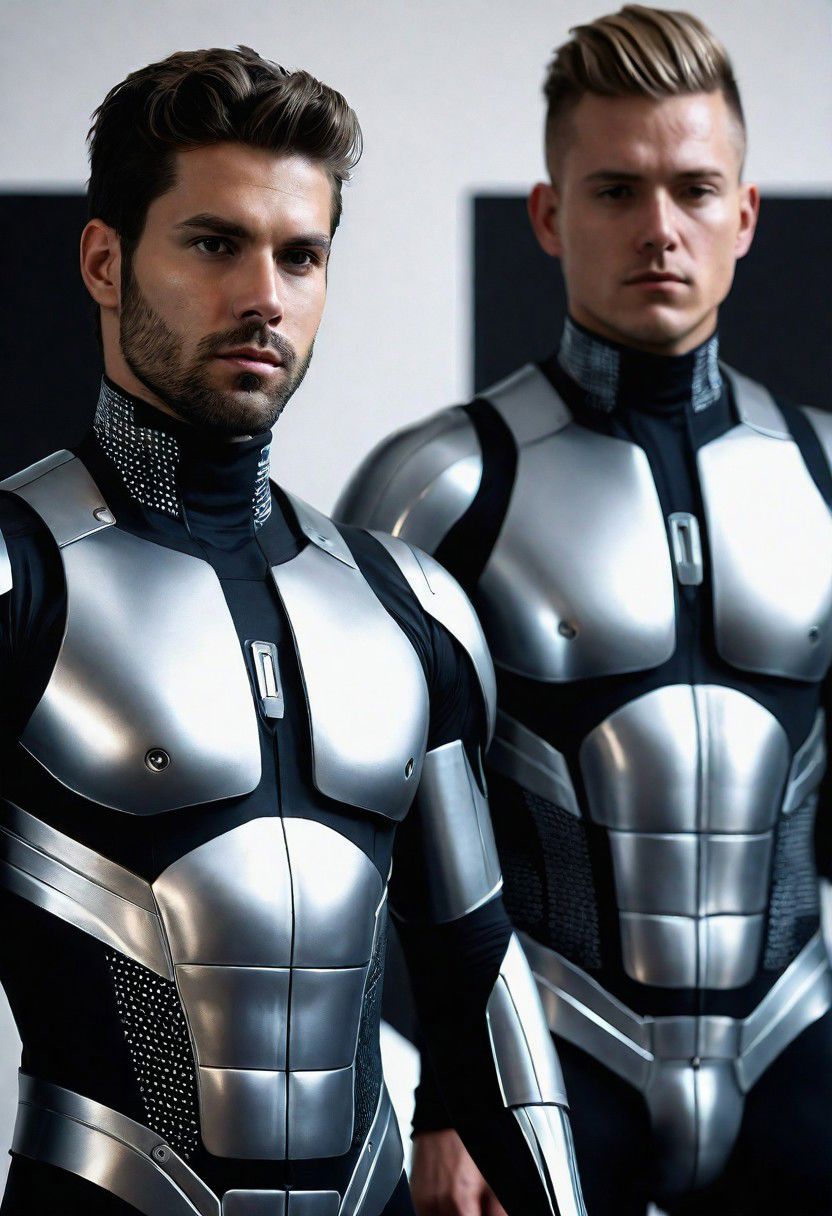 two 28-year-old American males, with Textured Crop with Fade hair, glazed faces, confused expressions, wearing skin tight latex jockstraps over his cybernetic suits, wearing skin tight dark-gray latex cybernetic robotic suits with silver latex details, standing at attention posture, inside a modern futuristic office, looking to the camera, detailed face, Cinematic, Photoshoot, Shot on 25mm lens, Depth of Field, Tilt Blur, Shutter Speed 1/1000, F/22, White Balance, 32k, Super-Resolution, Pro Photo RGB, Half rear Lighting, Backlight, Dramatic Lighting, Incandescent, Soft Lighting, Volumetric, Conte-Jour, Global Illumination, Screen Space Global Illumination, Scattering, Shadows, Rough, Shimmering, Lumen Reflections, Screen Space Reflections, Diffraction Grading, Chromatic Aberration, GB Displacement, Scan Lines, Ambient Occlusion, Anti-Aliasing, FKAA, TXAA, RTX, SSAO, OpenGL-Shader s, Post Processing, Post-Production, Cell Shading, Tone Mapping, CGI, VFX, SFX, insanely detailed and intricate, hyper maximalist, elegant, dynamic pose, photography, volumetric, ultra-detailed, intricate details, super detailed, ambient