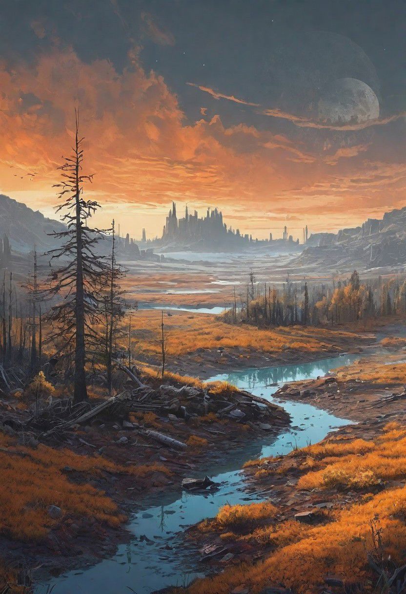 epic landscape, a post-apocalyptic world, seasons, flat vector illustration, different colour palette, muted colors, complex composition, intricate details, hightly detailed, improvisation, by Nikolai Dubovskoy, by Michael Klodt