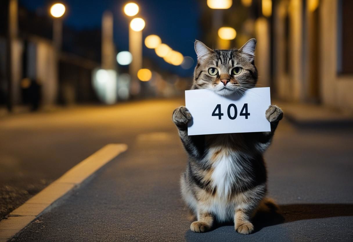 A sad cat on a street, holding up a card board sign with the text "404", background is empty street, no people around, shot at night