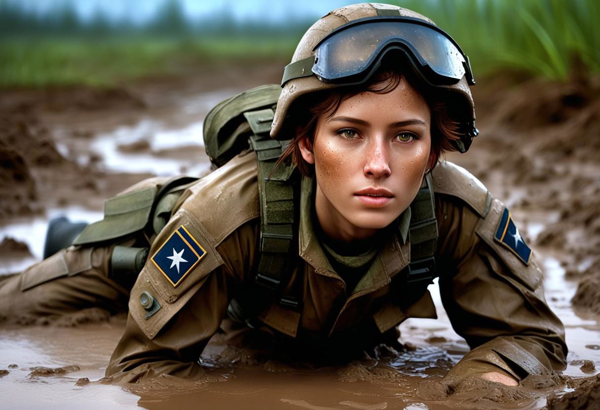 female soldier falls in the mud, crawling, her army clothes were torn and had holes, her face covered in mud, wounds, puddles of mud, battlefield, body, full body, symmetry, nature, subsurface scattering, translucent mod skin, rainy, Bioluminescent rain drop, light_particles, sexy posture, brown eyes, brown curly hair, all body, b3rli,