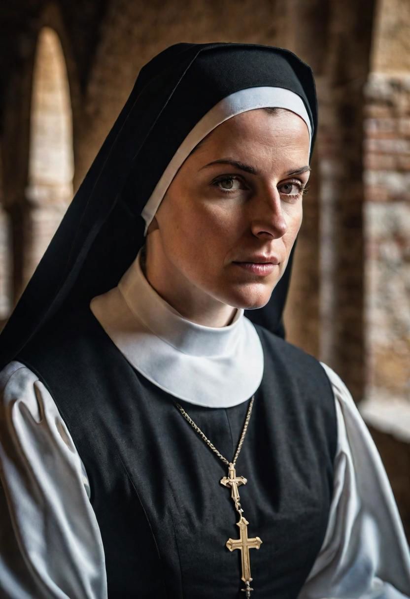 masterpiece, best quality, ultra highres, natural skin texture, brown hair, brown eyes, beautiful 30yo Nun of Monza (I Promessi Sposi), fierce expression, natural skin texture, ((1600's nun dress)), near a 1600 convent, Spring, 24mm, 8k textures, soft cinematic light, adobe lightroom, photolab, hdr, intricate, elegant, highly detailed, sharp focus, ((((cinematic look)))), soothing tones, insane details, intricate details, hyperdetailed, low contrast, soft cinematic light, dim colors, exposure blend, hdr, faded, full body, ((small eyes)), hyperealistic