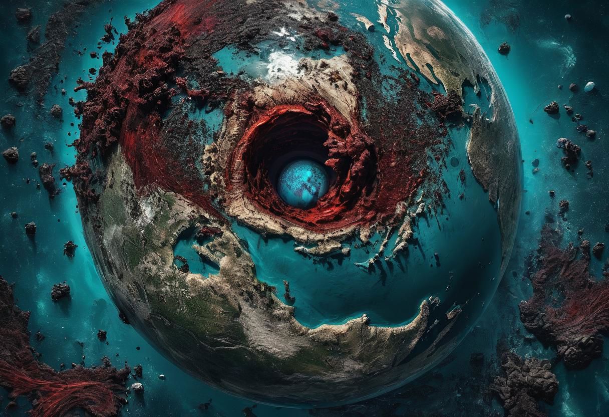 Planet earth floating in outer space, huge drain on it, turquoise Blood rinsing, masterpiece, best quality, 32k uhd, insane details, hyperdetailed, hyper quality, high detail, ultra detailed, photography
