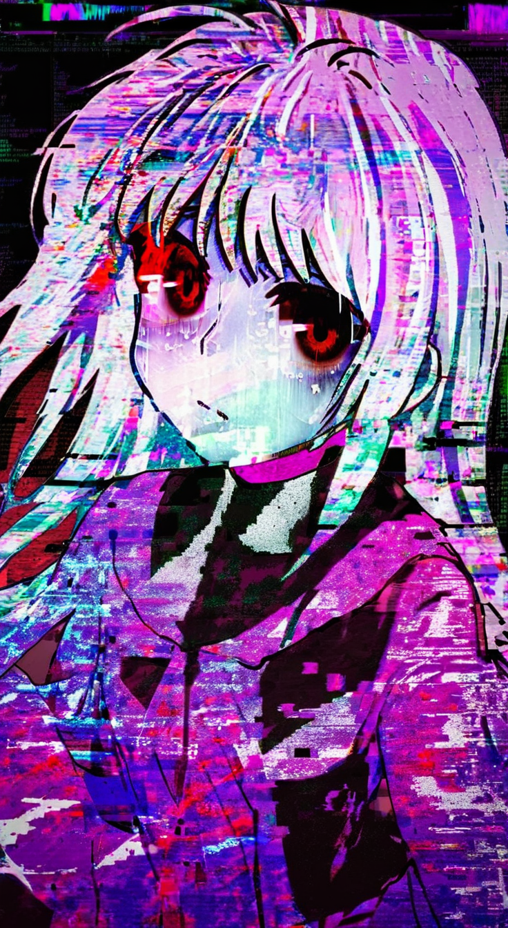 <lora:nfxlyria:1> nfxlyria, anime, glitch, glitchcore woman white hair red eyes