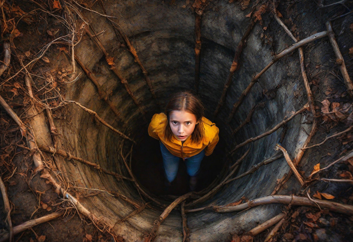 Create an image of a girl trapped in an abandoned vertical tube well, aerial view, dry land, dry trees, light rain, a landscape, dark clouds, her fear, confusion, sunset, dim overhead light, hyper realistic nature.