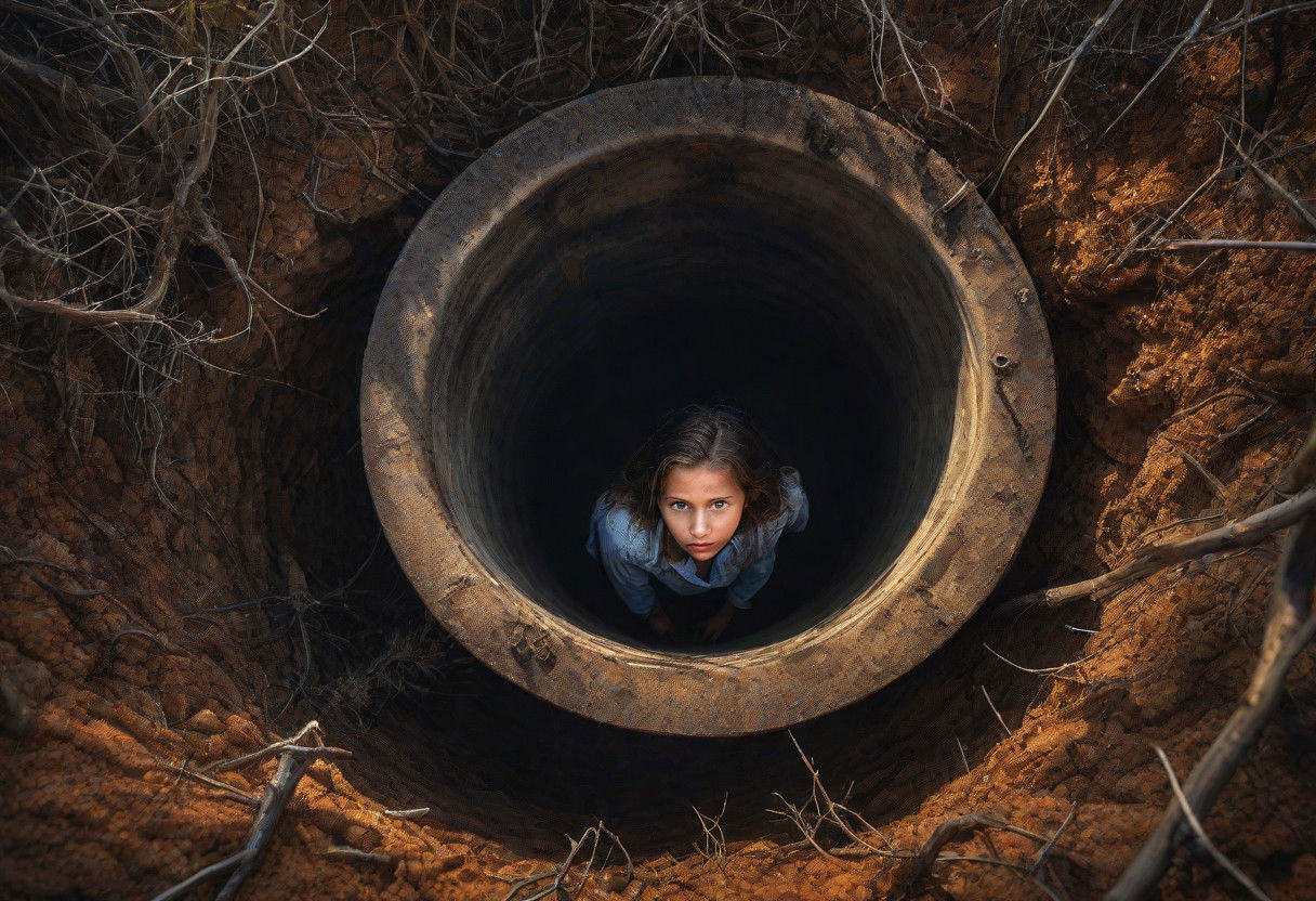 Create an image of a girl trapped in an abandoned vertical tube well, aerial view, dry land, dry trees, light rain, a landscape, dark clouds, her fear, confusion, sunset, dim overhead light, hyper realistic nature.