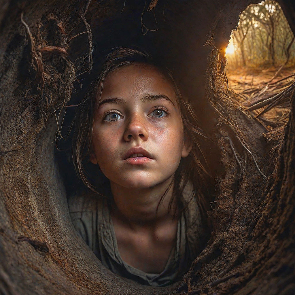 Create an image of a girl trapped in an abandoned vertical tube well, transparent,dry land, dry trees, light rain, a landscape, dark clouds, her fear, confusion, sunset, dim overhead light, hyper realistic character.
