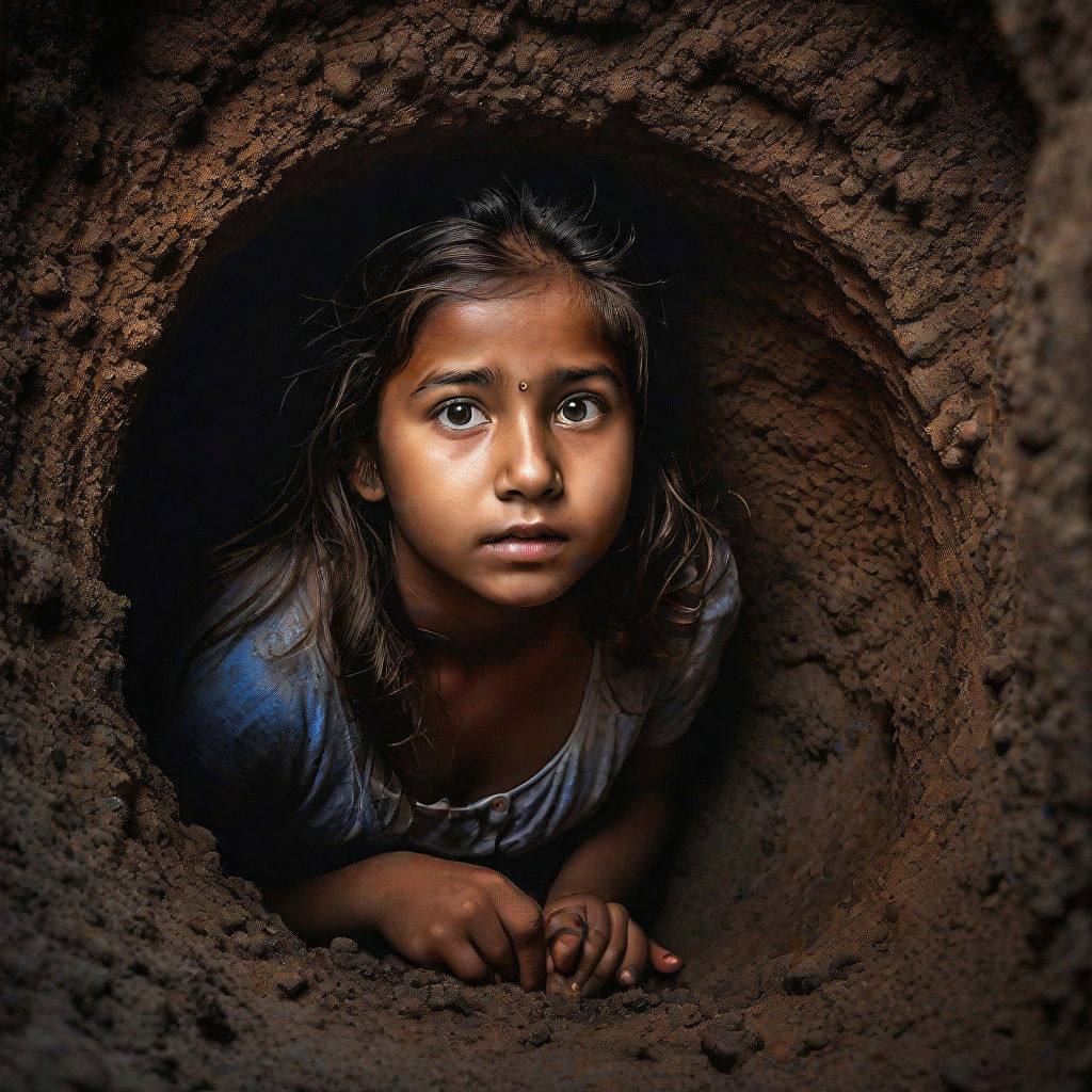 Illustrate the perspective of the trapped girl within the borewell. Showcase her innocent face framed by darkness, capturing her fear, confusion, and the dim light from above. Emphasize the isolation and vulnerability of her situation,beautiful:1.4), (intricate details, masterpiece, best quality:1.4),dynamic pose